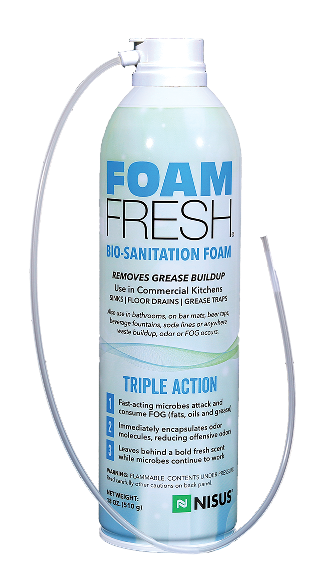 Foam Fresh is a powerful bio-remedial foam used to break down organic matter and eliminate odors while leaving a fresh, pleasant scent. It is designed to be applied as part of an ongoing maintenance program and intended for use in intense odor-causing situations. Foam Fresh doesn’t “cover up” odors. It uses microbes to attack the source of the smell, breaking down the organic matter and eliminating the odor for good.Use Foam Fresh to break down gunk in commercial kitchens, garbage recepticals, floor drains and sink drains. You can also use Foam Fresh to eliminate odors like urine, vomit and feces. Foam Fresh can be used in bathrooms, floor drains, drain surfaces, wall voids, walls, floors, carpets, urinals, toilets, food preparation areas, refuse containers, garbage cans and dumpsters, as well as many other areas.