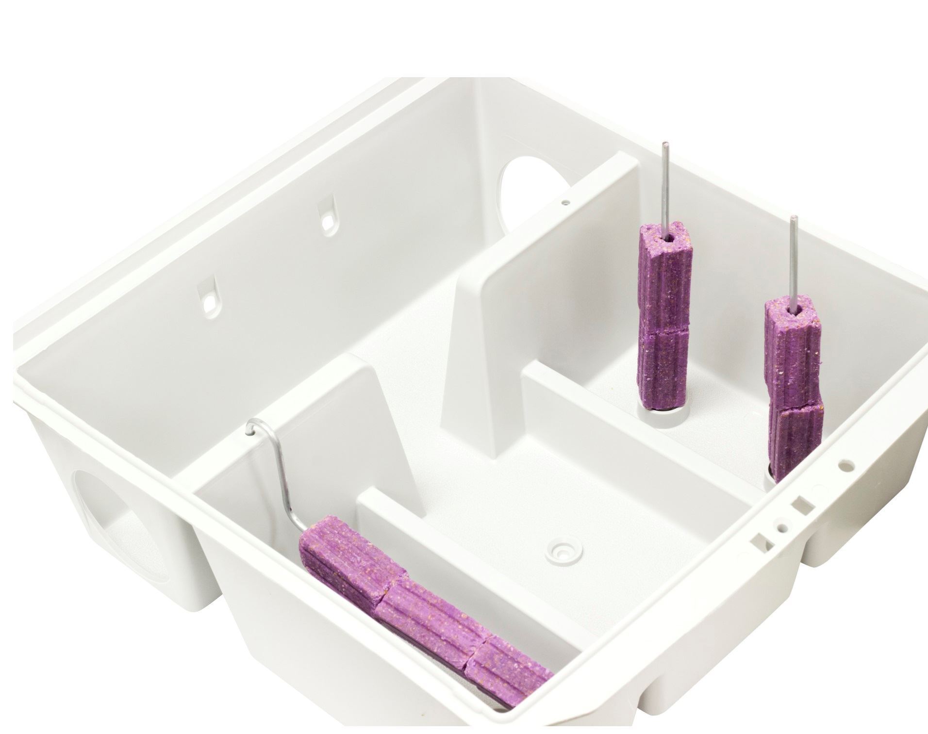 PROTECTA Bait Station is large enough to accommodate six rats and holds up to one pound/450g of bait, a pint/475ml of liquid bait, or a T-Rex Rat Trap. Horizontal and vertical bait securing rods keep Bell's BLOX baits securely in the station. Bait also lasts longer because the rods elevate it above moisture build-up on the bottom of the station.